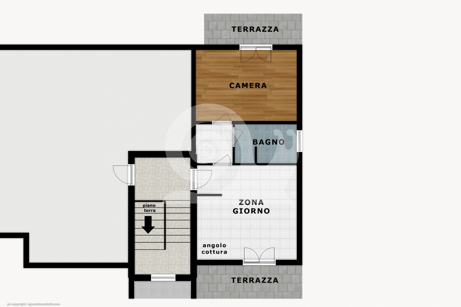 • DISPOSIZIONE INTERNA: zona giorno con angolo cottura e accesso al terrazzo, disimpegno, camera con accesso al terrazzo e bagno