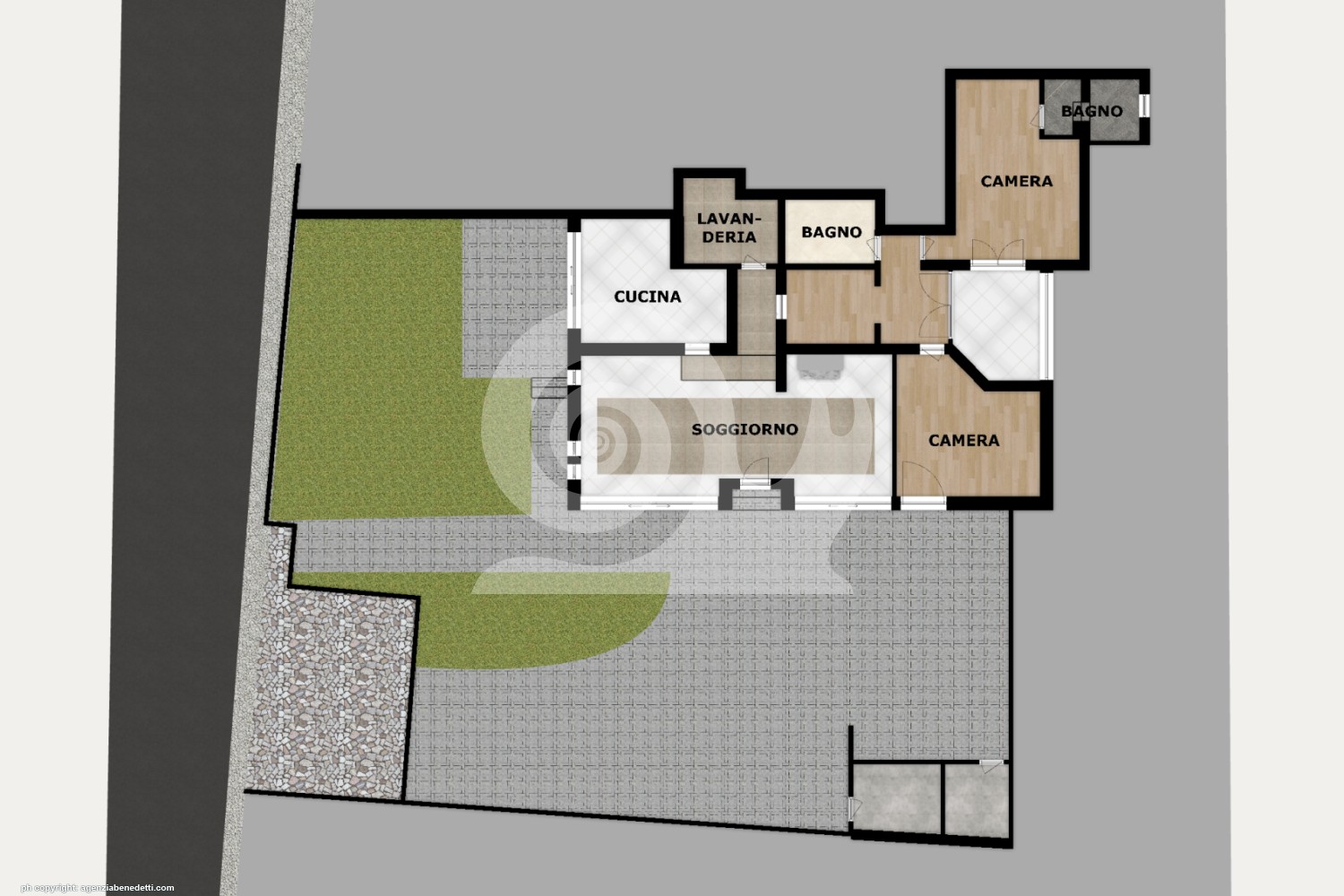 Il disegno del giardino è parte integrante dell’abitazione è curato e arredato con la stessa dedizione di tutta la casa. Lo specchio verde del giardino si armonizza con la cornice pavimentata da mattonelle e basta un solo click sul telecomando a muovere i cancelli di entrata e uscita.